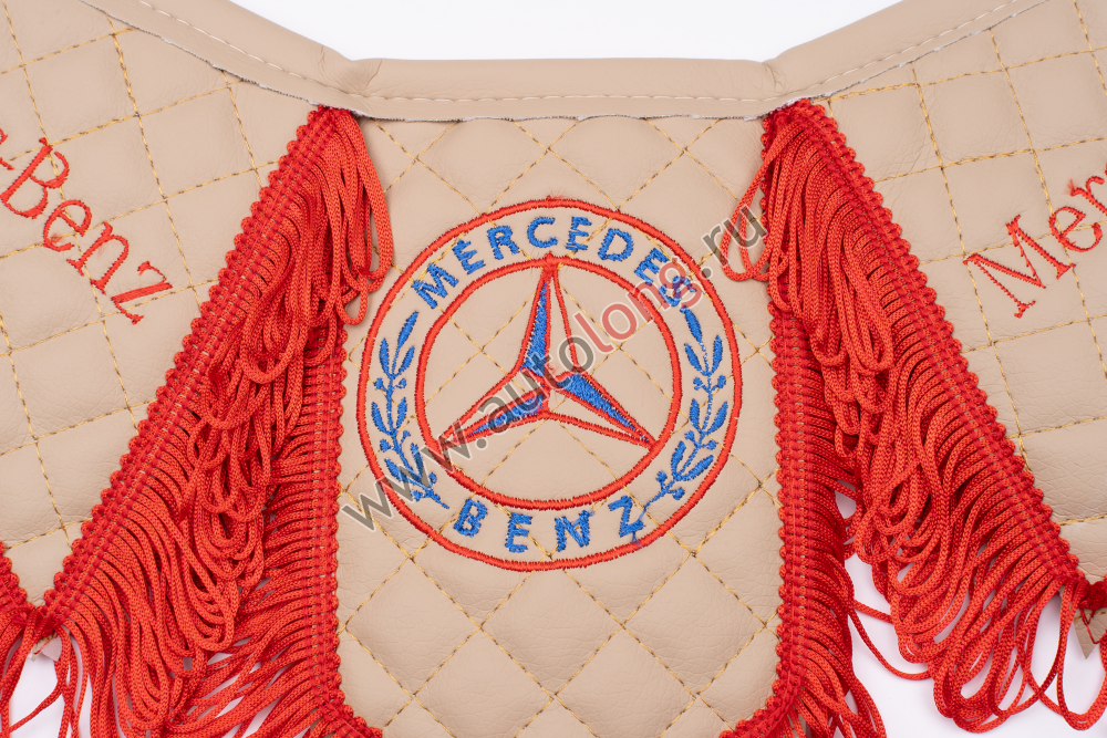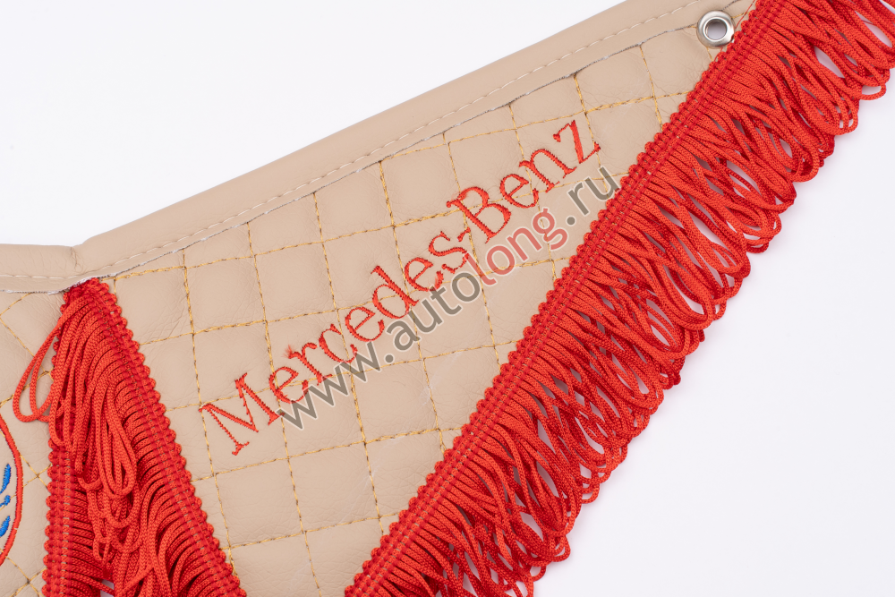 Тройной вымпел с присосками для автомобилей Мерседес, изготовлен из бежевой экокожи с вышивкой и с красной бахромой.