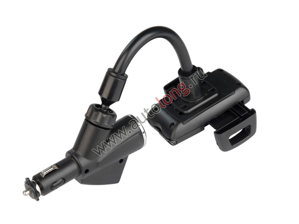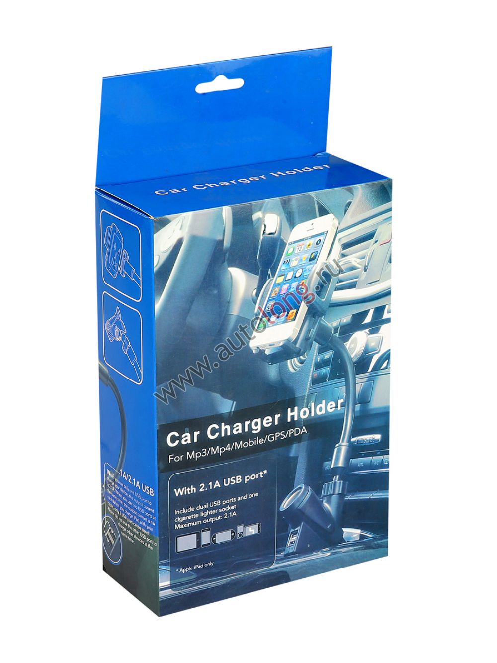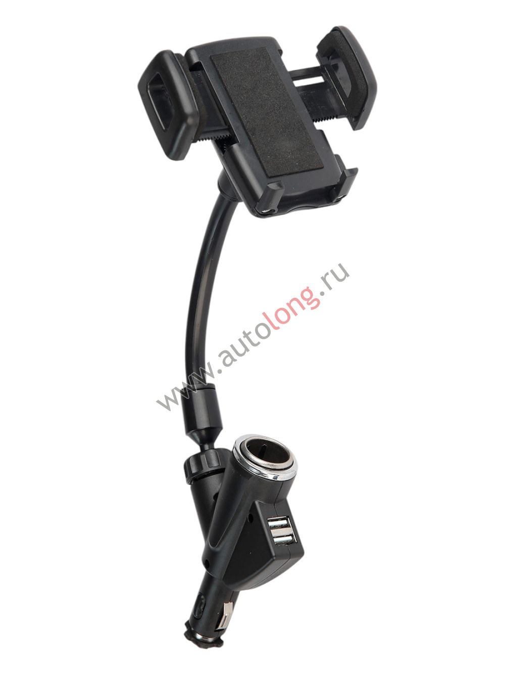 Зажимной держатель телефонов и смартфонов в прикуриватель автомобиля с двумя USB разъемами и гнездом прикуривателя.